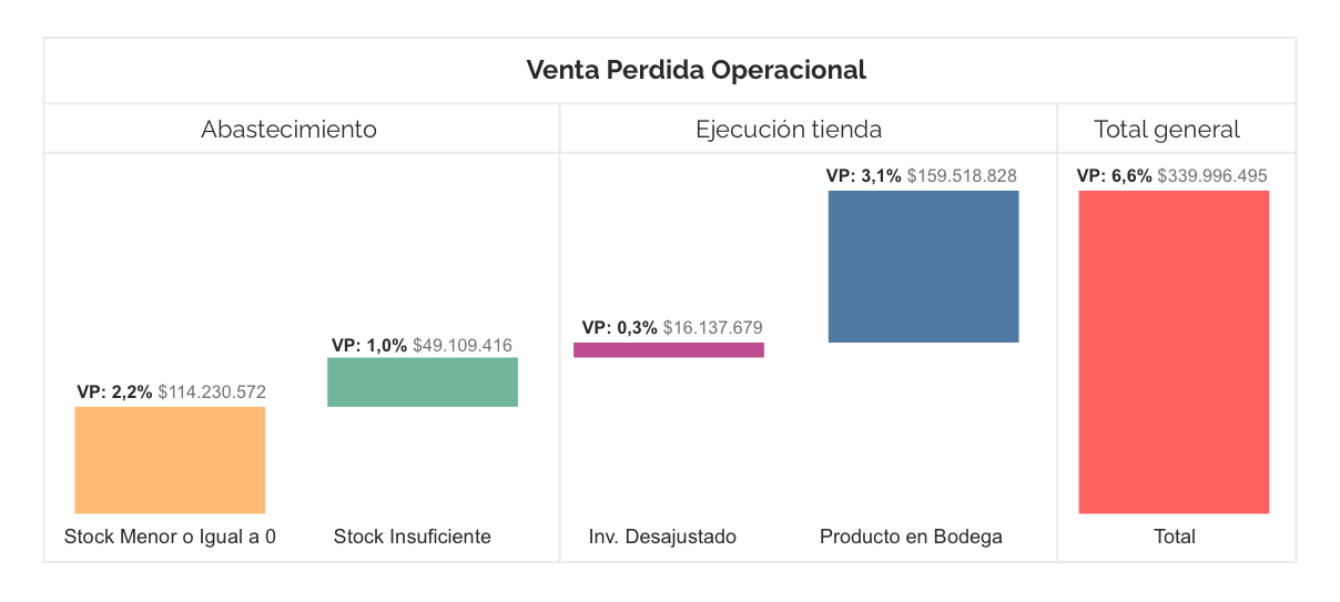 Tal como lo mencionamos anteriormente, las pérdidas a las que se enfrentan las compañías se pueden agrupar en tres motivos o causales: venta perdida por abastecimiento, venta perdida operacional o por ejecución y venta perdida comercial.