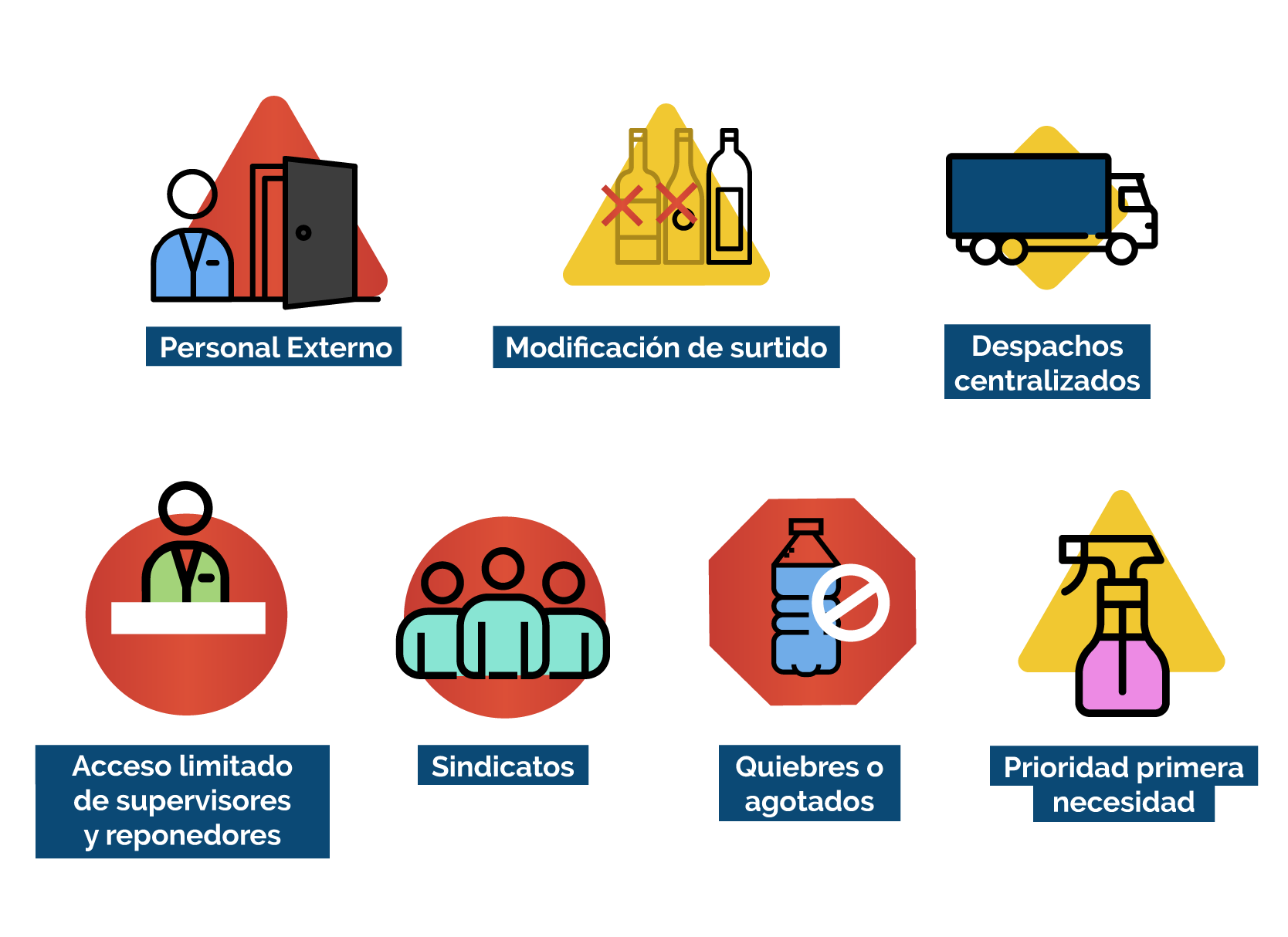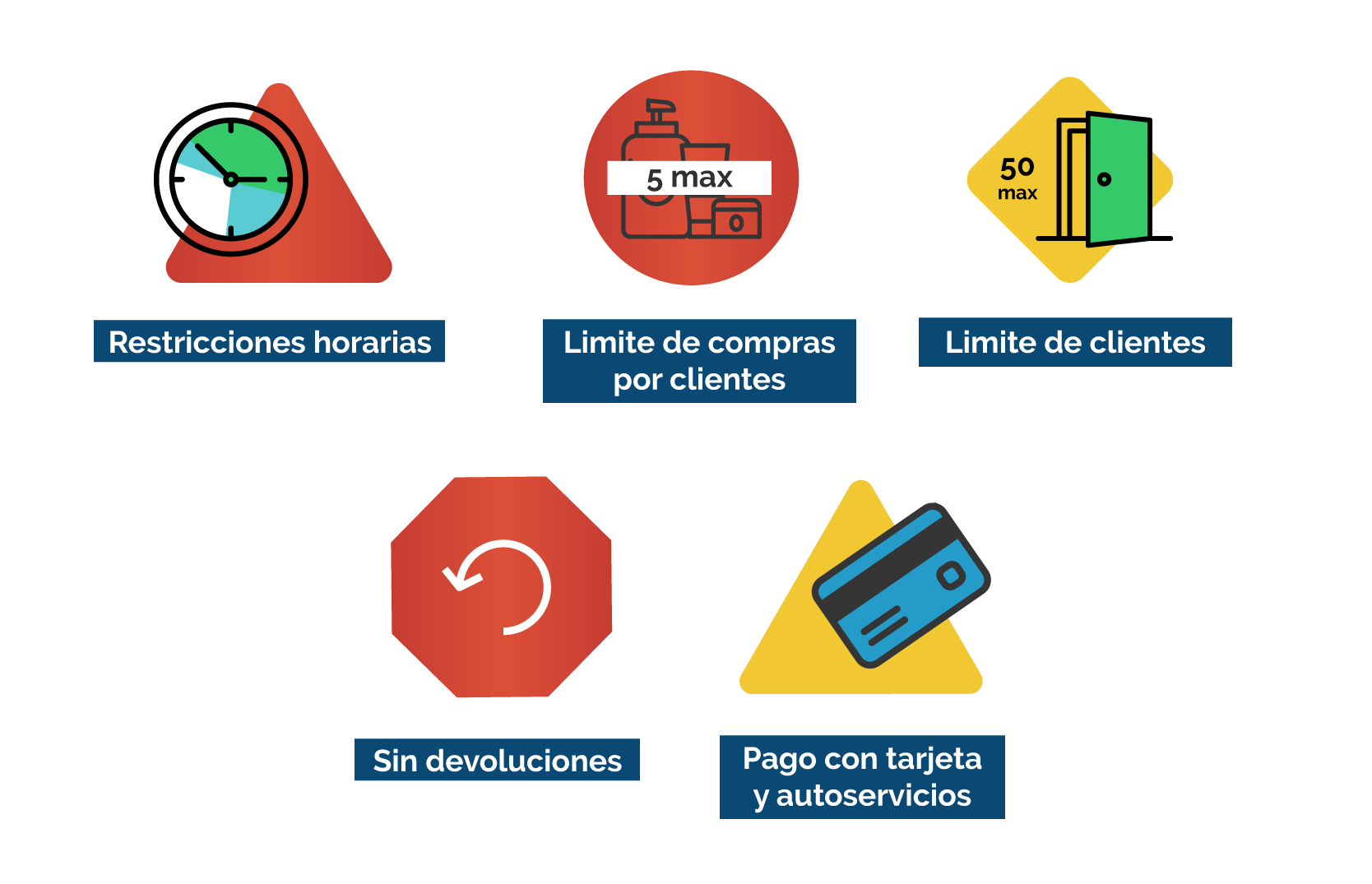 Se controla el ingreso de personas a los supermercados y se señaliza la distancia mínima exigida entre personas. Muchos supermercados se acogen a los reglamentos sanitarios de cada país al no permitir más de 50 personas dentro de un recinto. - No se permiten devoluciones de productos